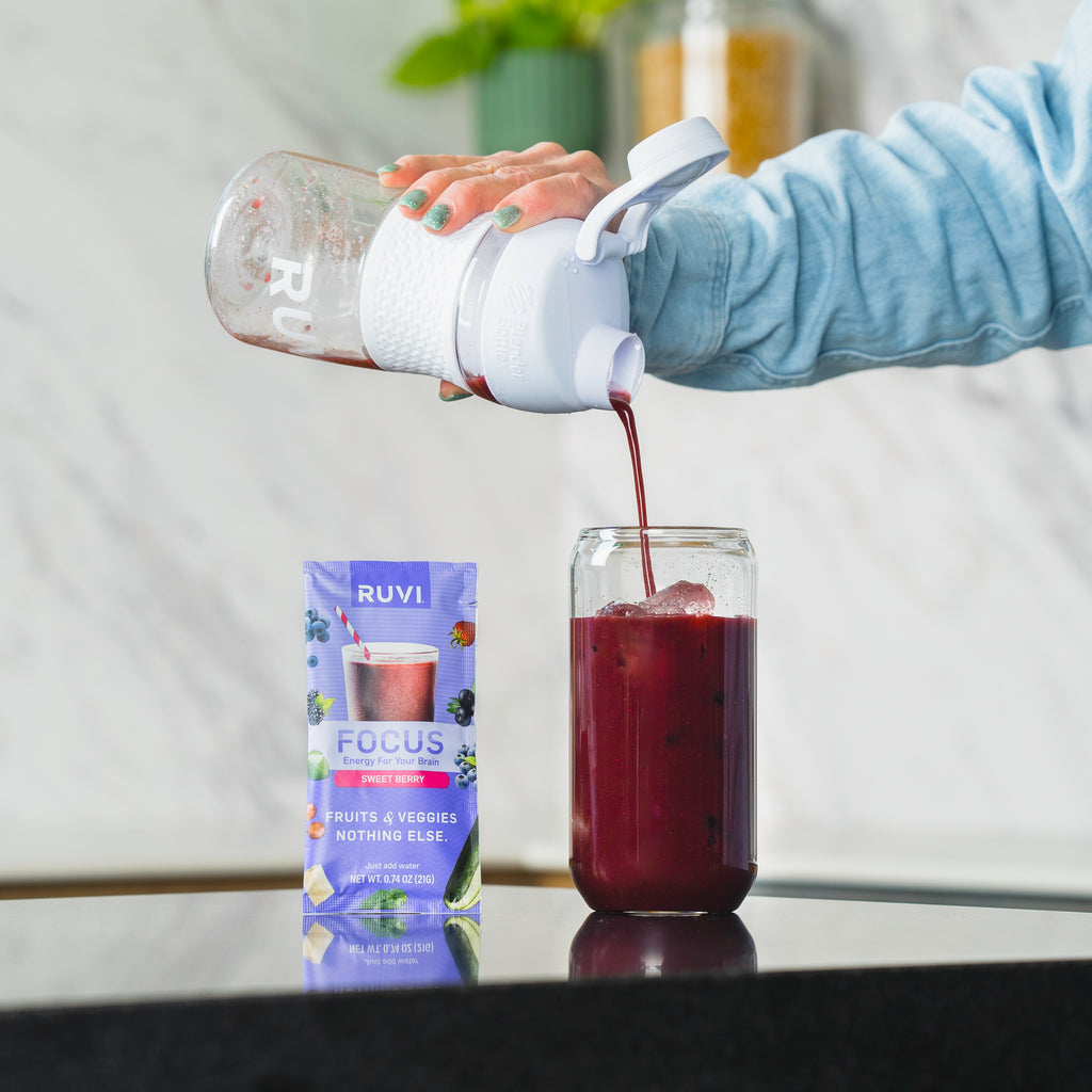 Ruvi Focus freeze dried smoothie mix has 10 fruits and vegetables to energize your brain and promote focus.